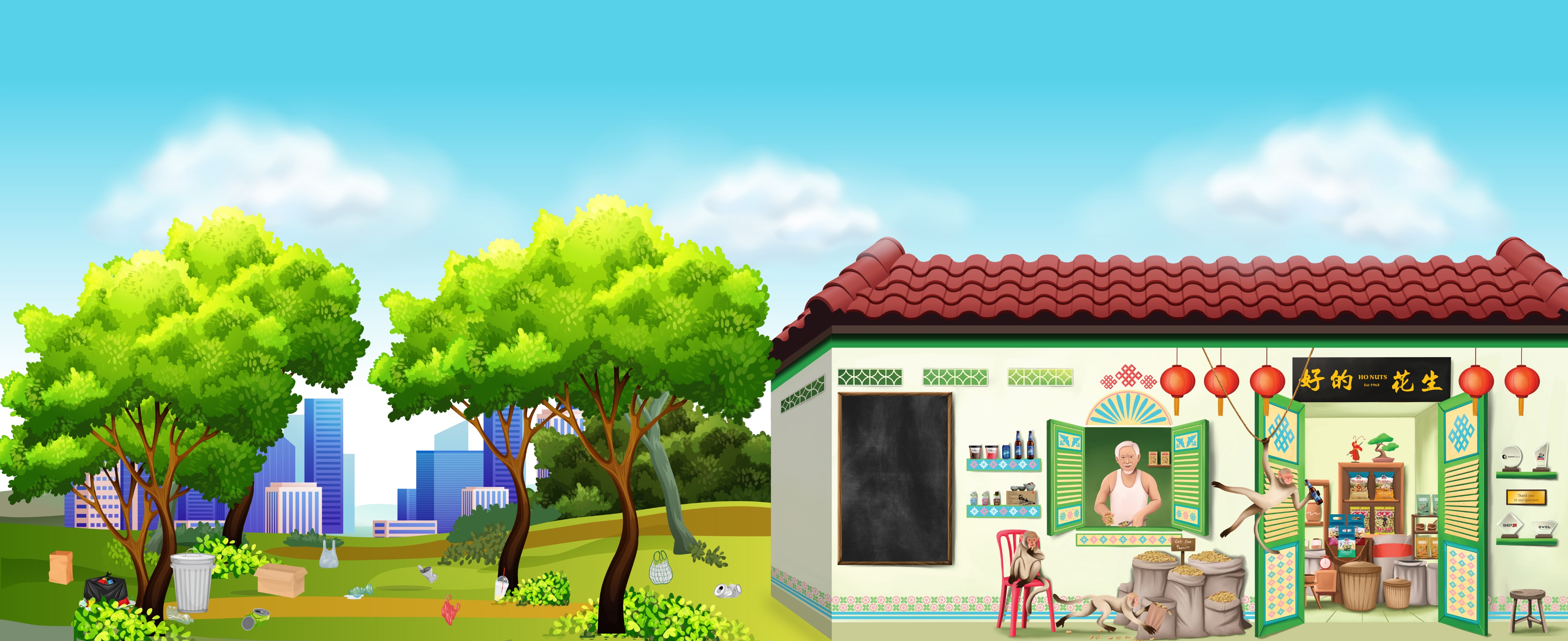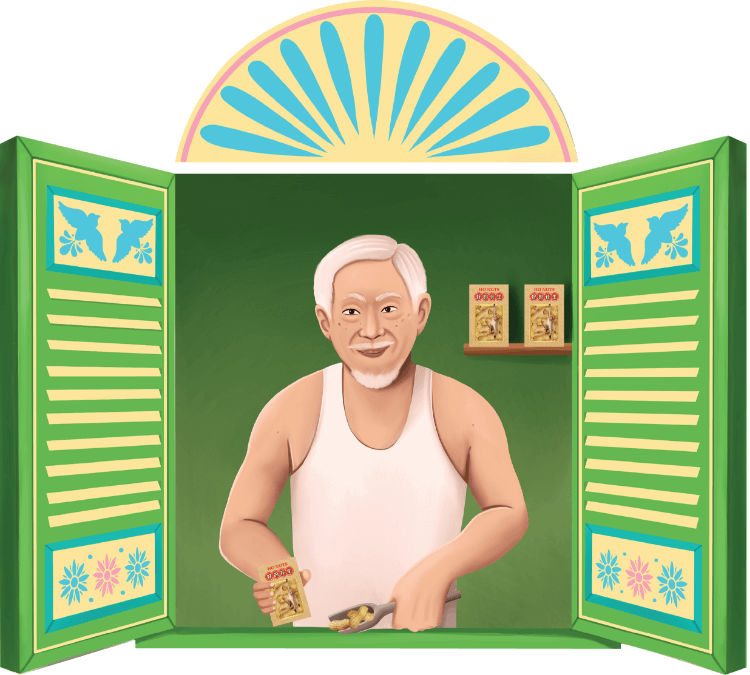 Ho Nuts is a fictional brand brought to life by the characters Uncle Ho and Kacang, who join forces to create the tastiest peanuts, sustainably sourced and packaged in eco-friendly materials.