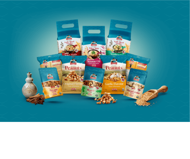 Marketed as “Farmer Brand” in the 1940s, Mei Heong Yuen supplied freshly roasted peanuts locally. By the 1970s, their peanuts were exported globally. To diversify, they also introduced products like Knife Sliced Noodles.